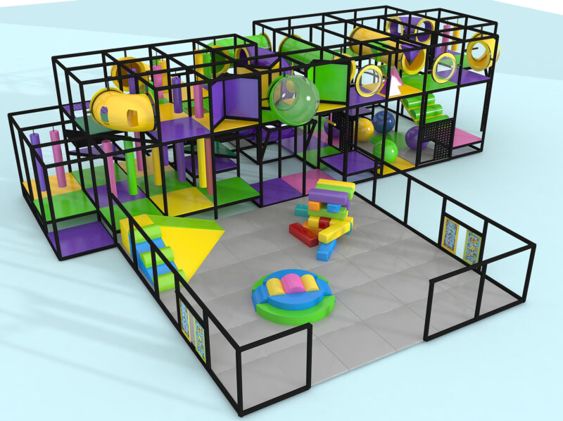 Indoor Playground GPS1307 is a custom indoor playsystem for children three to twelve years of age. The softplay unit measures 44 ft. wide by 11 ft. high and a length of 16 ft. The minimum room space required for this children’s play equipment is approximately 50 ft. room width with a 13 ft. ceiling and 22 ft. room length. Total area: 704 sq ft. Medium Size Indoor Playground.