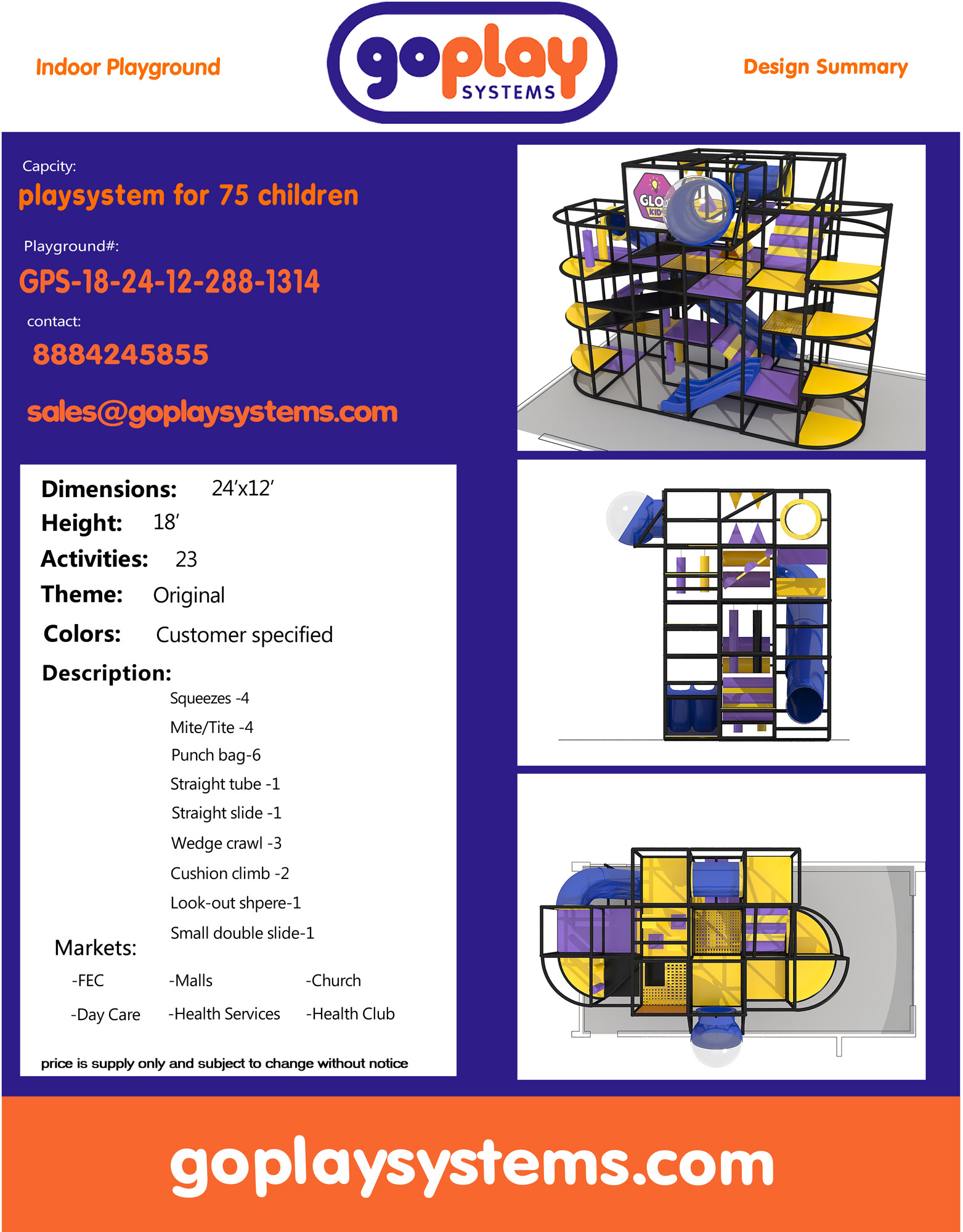 El parque infantil interior GPS1314 es un sistema de juego interior personalizado para niños de tres a doce años. La unidad de juego blando mide 7,3 m de ancho por 5,5 m de alto y 3,6 m de largo. El espacio mínimo requerido para este equipo de juego infantil es de aproximadamente 9,1 m de ancho, 6,1 m de techo y 5,5 m de largo. Superficie total: 27,5 m². Parque infantil interior de tamaño mediano.