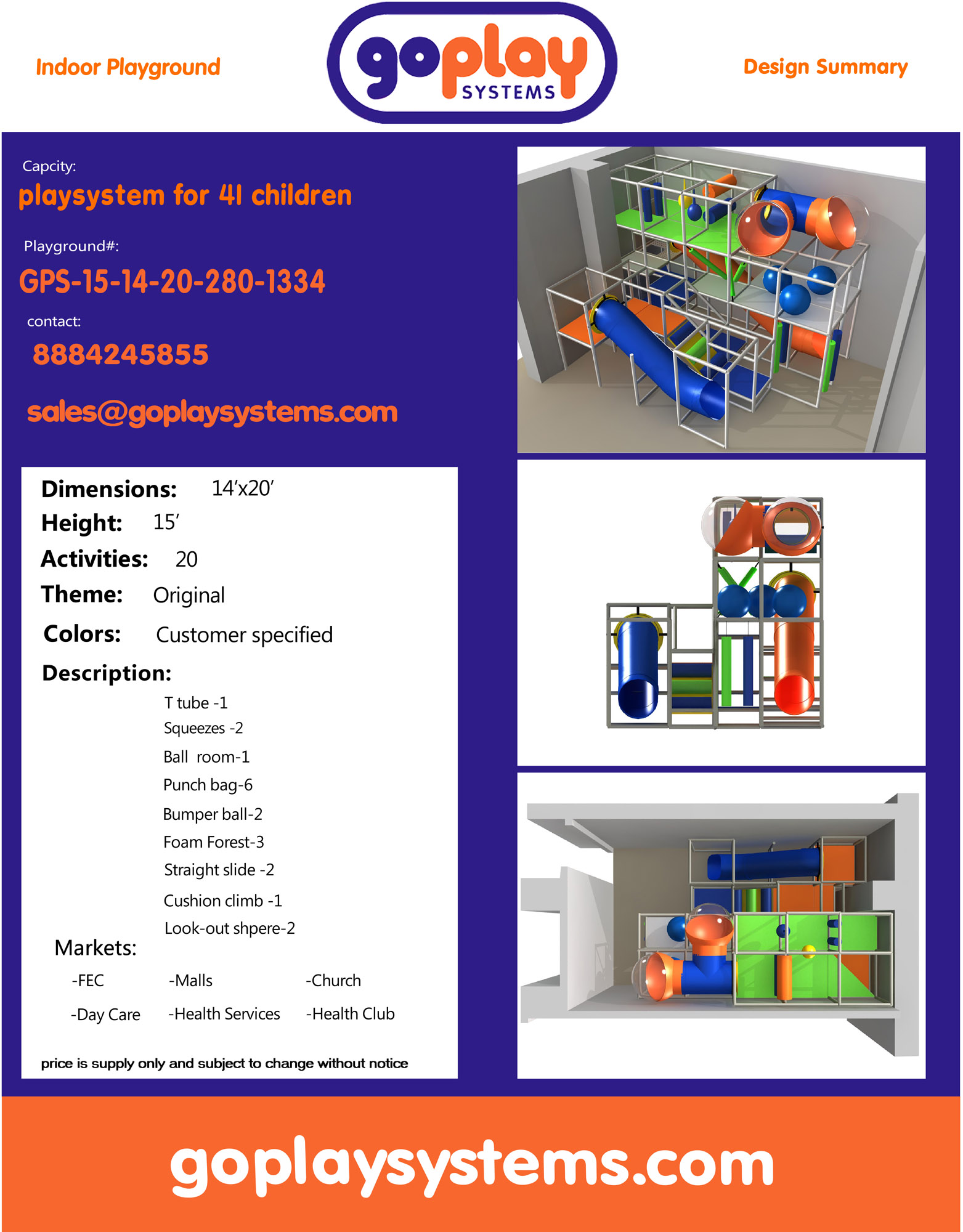 Indoor Playground GPS1334 is a custom indoor playsystem for children three to twelve years of age. The softplay unit measures 14 ft. wide by 15 ft. high and a length of 20 ft. The minimum room space required for this children’s play equipment is approximately 20 ft. room width with a 17 ft. ceiling and 26 ft. room length. Total area: 280 sq ft. Medium Size Indoor Playground.