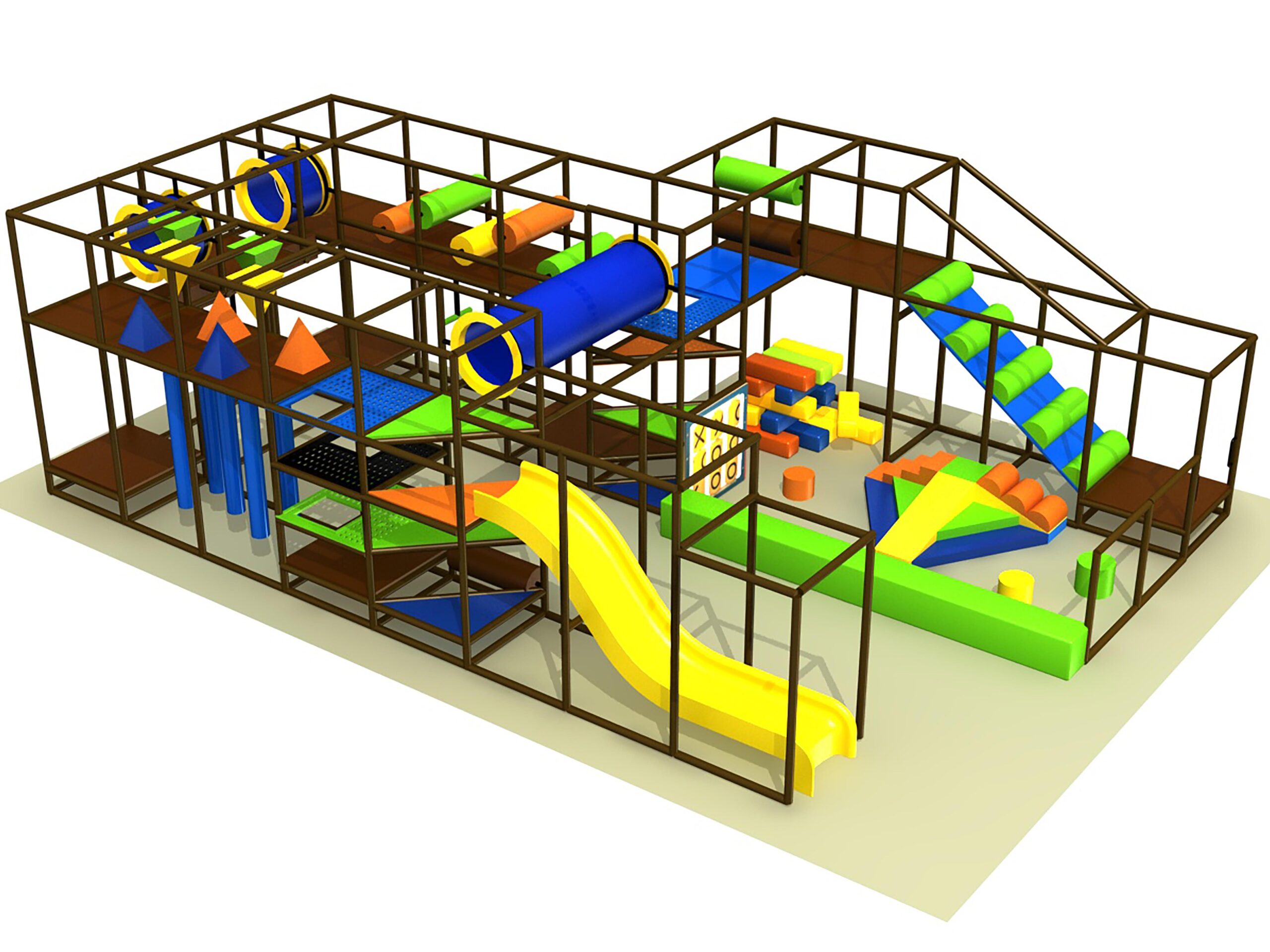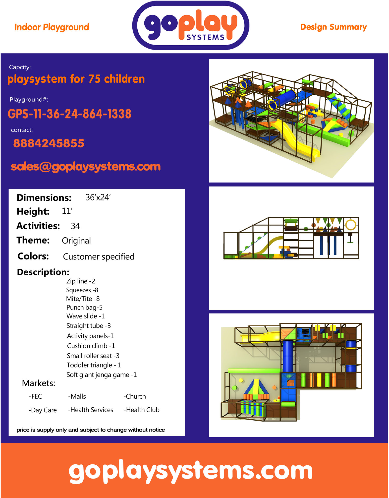 Indoor Playground GPS1338 is a custom indoor playsystem for children three to twelve years of age. The softplay unit measures 36 ft. wide by 11 ft. high and a length of 24 ft. The minimum room space required for this children’s play equipment is approximately 42 ft. room width with a 13 ft. ceiling and 30 ft. room length. Total area: 864 sq ft. Large Size Indoor Playground.