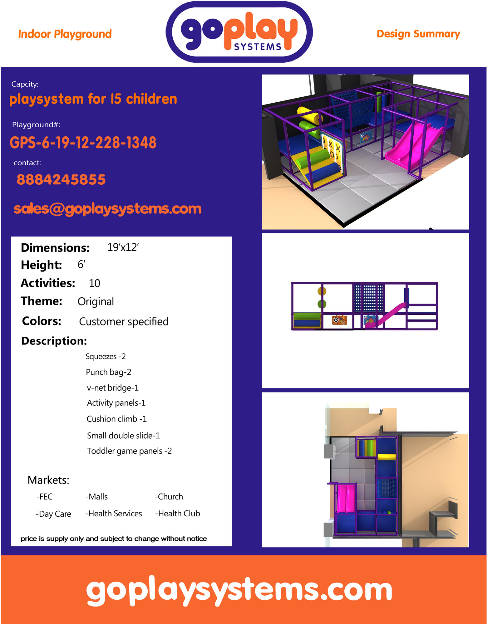 Indoor Playground GPS1348 is a custom indoor playsystem for children three to twelve years of age. The softplay unit measures 19 ft. wide by 6 ft. high and a length of 1 ft. The minimum room space required for this children’s play equipment is approximately 25 ft. room width with a 8 ft. ceiling and 7 ft. room length. Total area: 228 sq ft. Medium Size Indoor Playground.