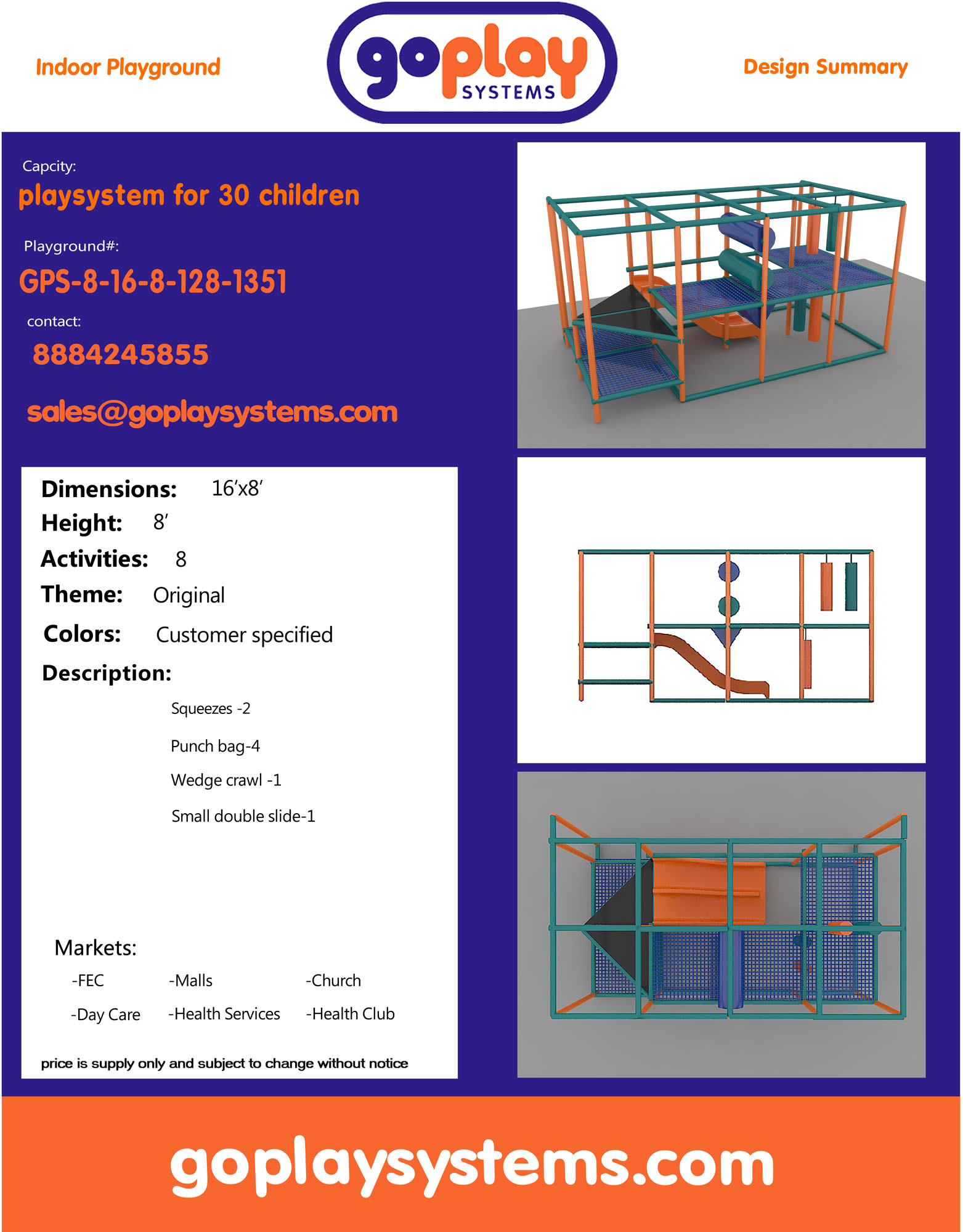 Indoor Playground GPS1351 is a custom indoor playsystem for children three to twelve years of age. The softplay unit measures 16 ft. wide by 8 ft. high and a length of 8 ft. The minimum room space required for this children’s play equipment is approximately 22 ft. room width with a 10 ft. ceiling and 14 ft. room length. Total area: 128 sq ft. Small Size Indoor Playground.