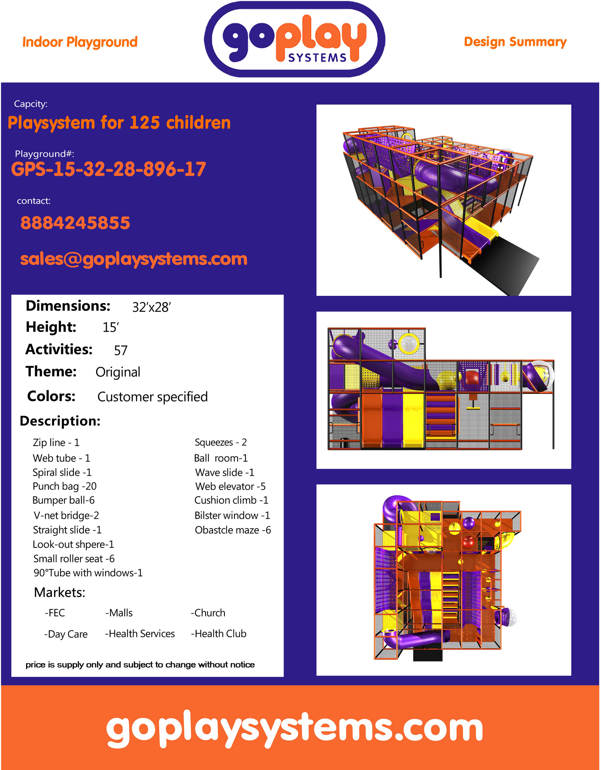 Indoor Playground GPS17 is a custom indoor playsystem for children three to twelve years of age. The softplay unit measures 32 ft. wide by 15 ft. high and a length of 28 ft. The minimum room space required for this children’s play equipment is approximately 38 ft. room width with a 17 ft. ceiling and 34 ft. room length. Medium Size Indoor Playground.