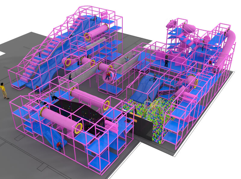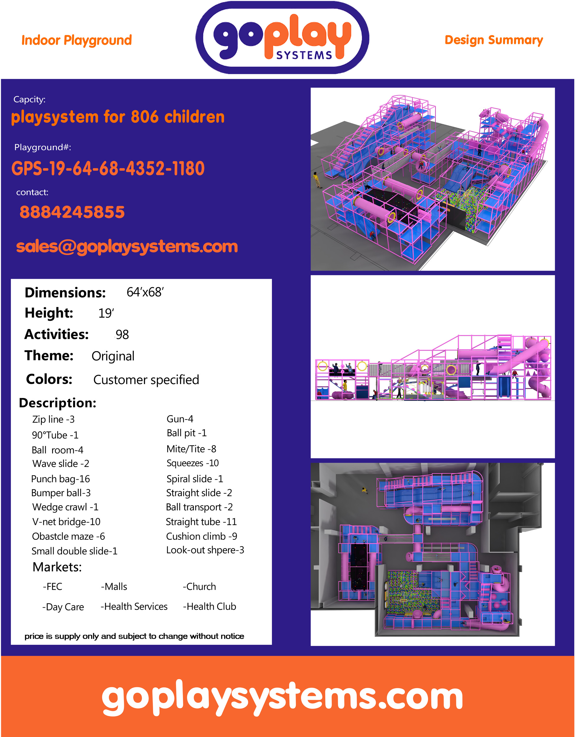 Indoor Playground GPS180 is a custom designed modular soft play system developed to safely accommodate children. The playground system measures 64 ft. wide by 19 ft. high and a length of 68 ft. The minimum indoor room space required for this playground is approximately 70 ft. room width with a 21 ft. ceiling and 74 ft. room length. Medium Size Indoor Playground.
