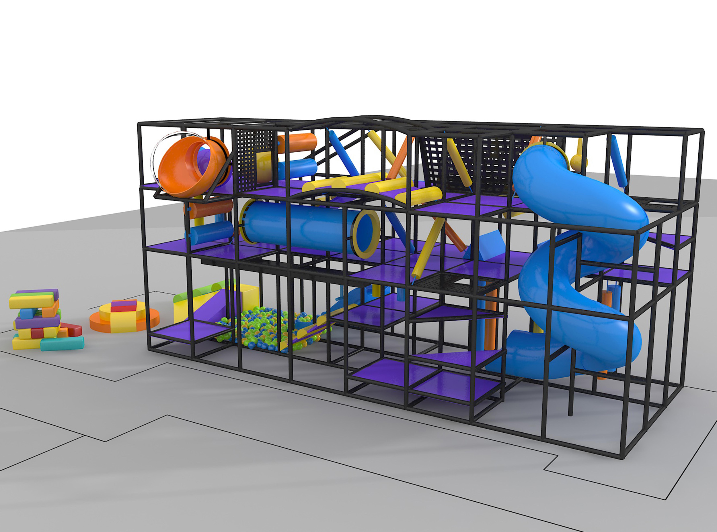 Indoor Playground GPS184 is a custom designed modular soft play system developed to safely accommodate children. The playground system measures 12 ft. wide by 15 ft. high and a length of 32 ft. The minimum indoor room space required for this playground is approximately 18 ft. room width with a 17 ft. ceiling and 38 ft. room length. Medium Size Indoor Playground.