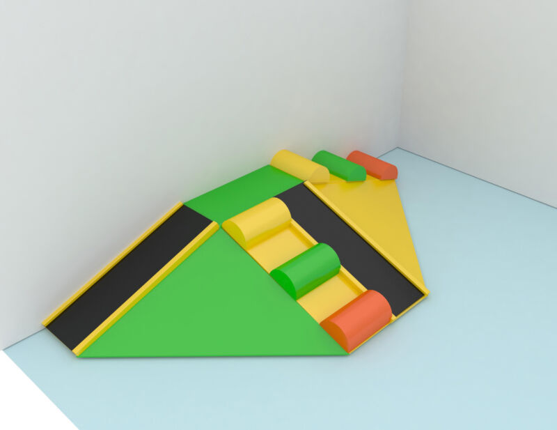 Indoor Playground GPS850 is a custom designed modular soft play system developed to safely accommodate children. The playground system measures 15 ft. wide by 2 ft. high and a length of 8 ft. The minimum indoor room space required for this playground is approximately 21 ft. room width with a 4 ft. ceiling and 14 ft. room length. Medium Size Indoor Playground.