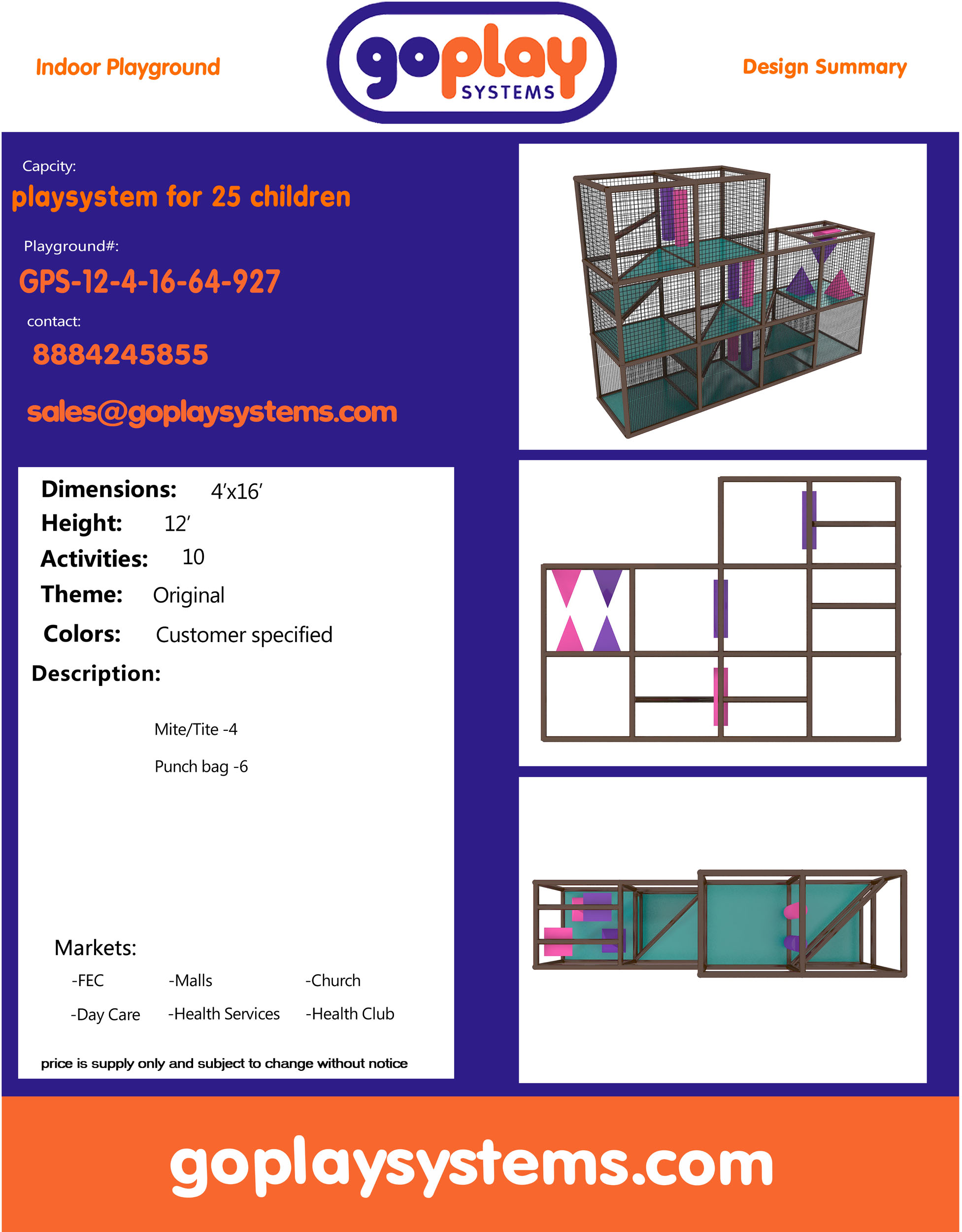 Indoor Playground GPS927 is a custom designed module soft play system developed to safely accommodate children 3 – 12 years of age. The playground system measures 12 ft. H x 4 ft. W x 16 ft.