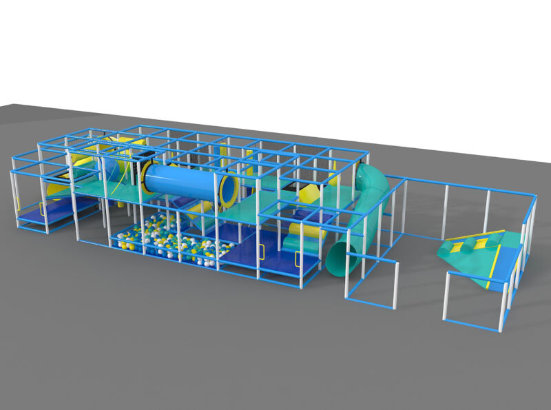 Indoor Playground GPS934 is a custom designed modular soft play system developed to safely accommodate children. The playground system measures 16 ft. wide by 9 ft. high and a length of 52 ft. The minimum indoor room space required for this playground is approximately 22 ft. room width with a 11 ft. ceiling and 58 ft. room length. Medium Size Indoor Playground.