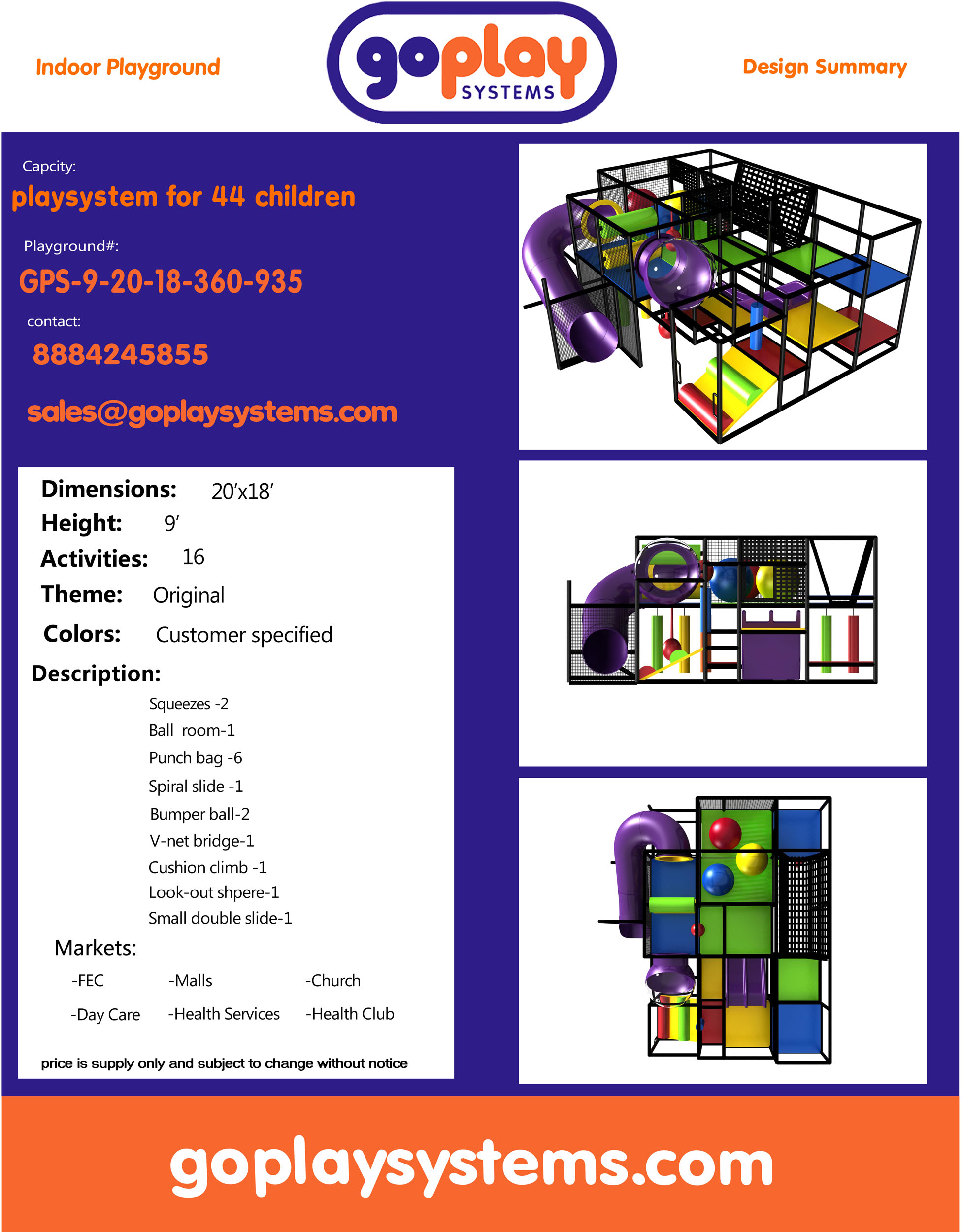Availability: In-stock Brand: Go Play Systems SKU: GPS-9-20-18-360-935 Shipping: Free Shipping US to lower 48 states. Shipping Policy Return and Refund Policy *GoPlay sells worldwide. Prices may not include additional shipping and handling charges to your specific location. Contact us for current international shipping rates.