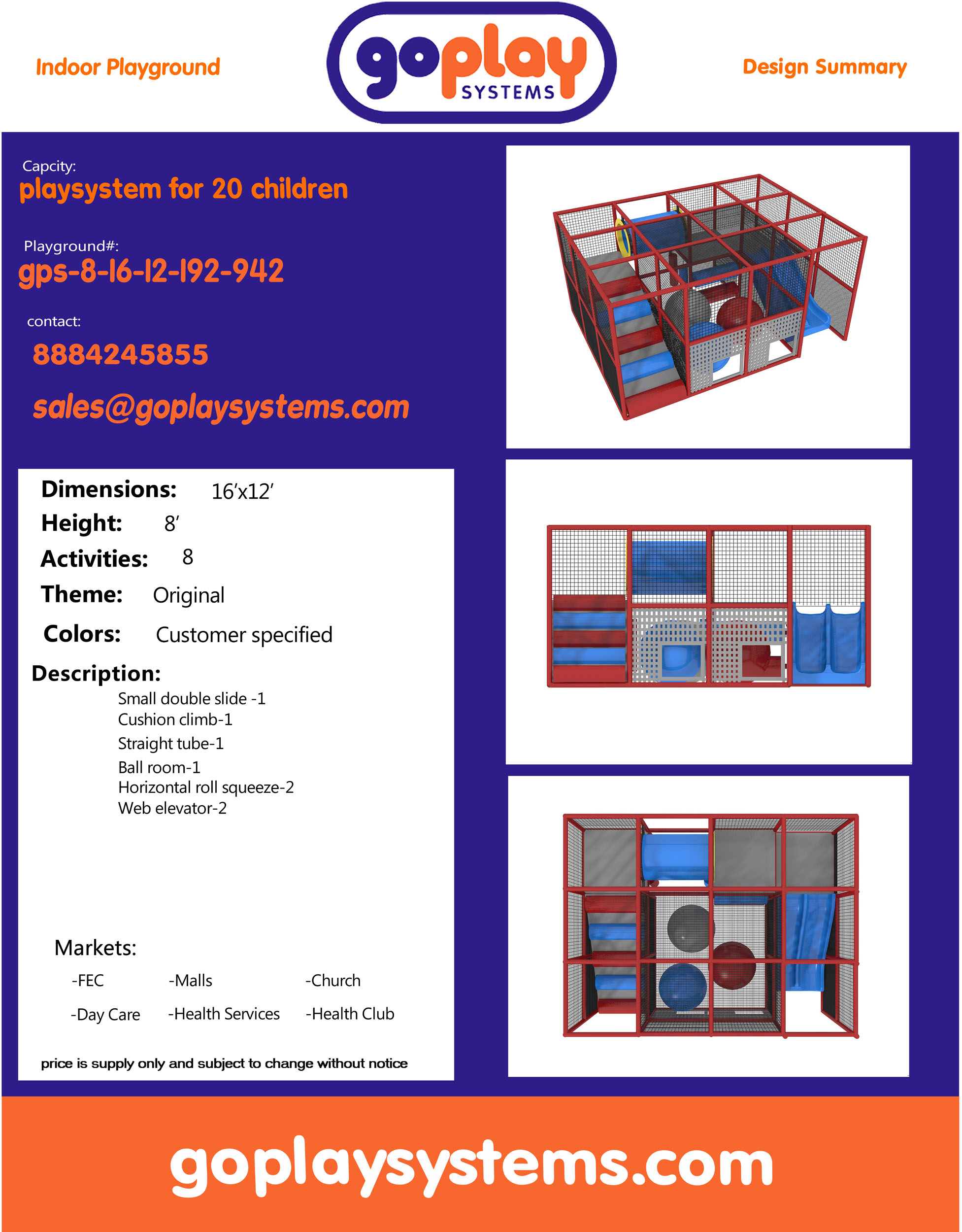 Availability: In-stock Brand: Go Play Systems SKU: GPS-8-16-12-192-942 Shipping: Free Shipping US to lower 48 states. Shipping Policy Return and Refund Policy *GoPlay sells worldwide. Prices may not include additional shipping and handling charges to your specific location. Contact us for current international shipping rates.