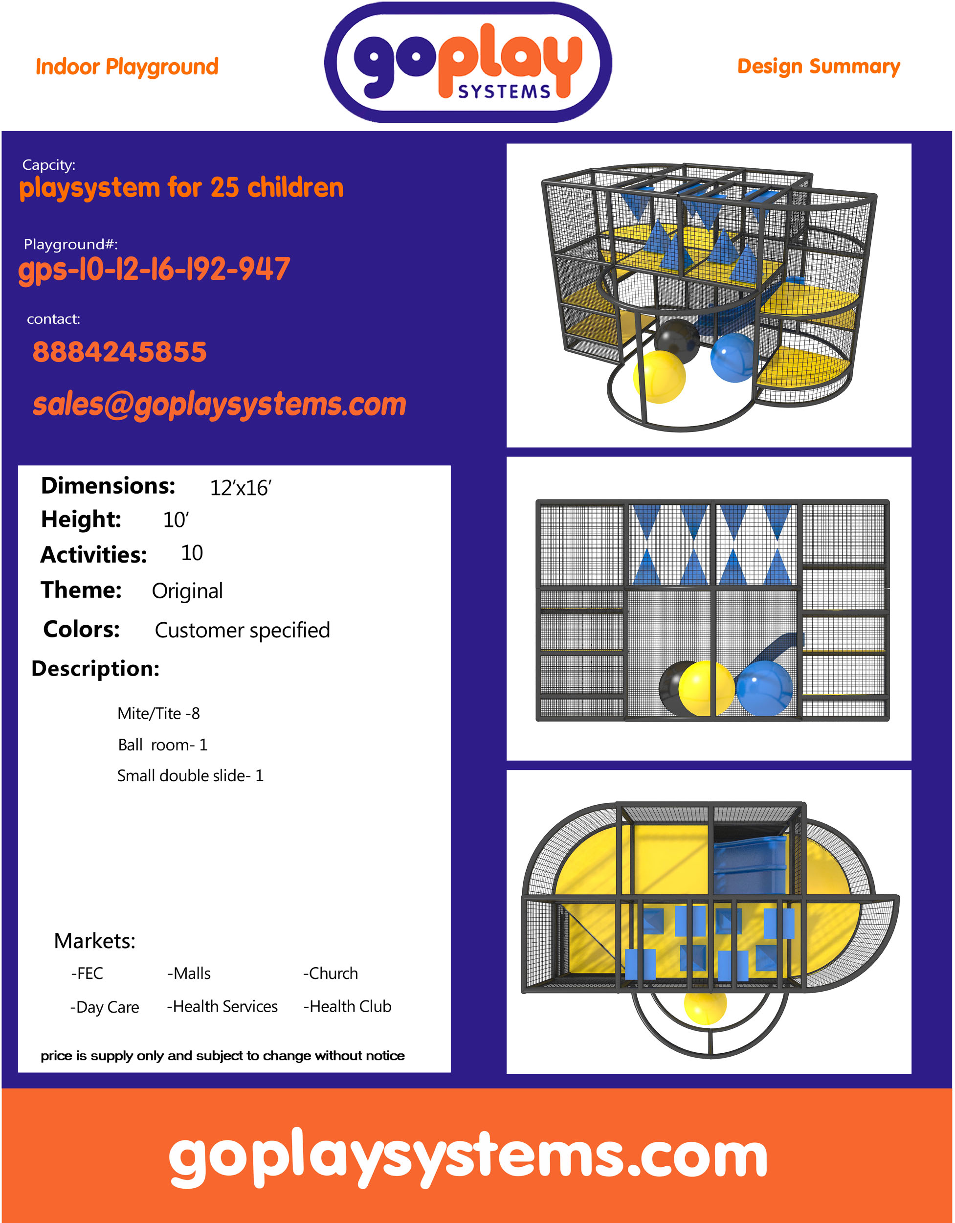 Indoor Playground GPS947 is a custom designed module soft play system developed to safely accommodate children 3 – 12 years of age. The playground system measures 10 ft. H x 12 ft. W x 16 ft.