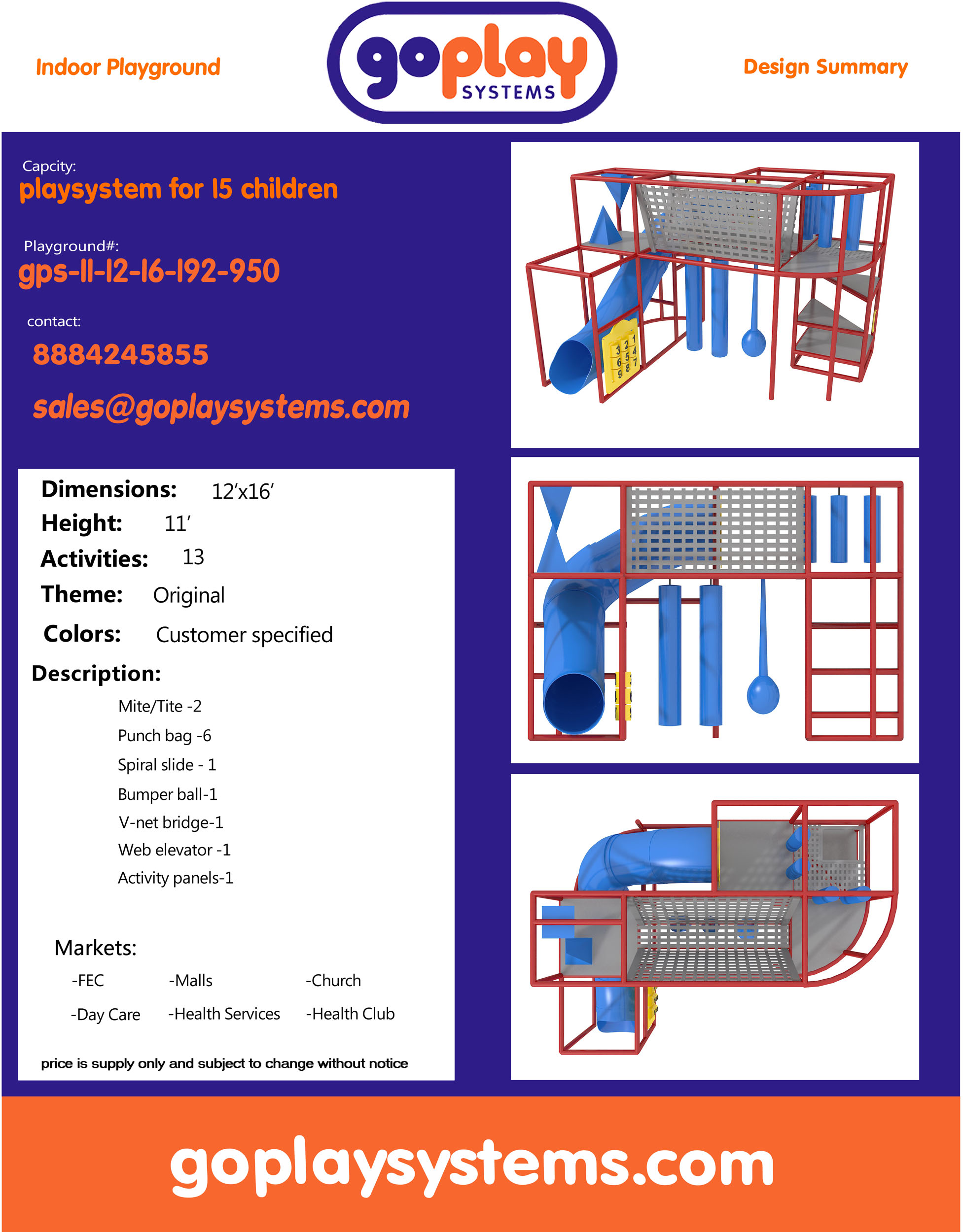 Indoor Playground GPS950 is a custom designed module soft play system developed to safely accommodate children 3 – 12 years of age. The playground system measures 11 ft. H x 12 ft. W x 16 ft.