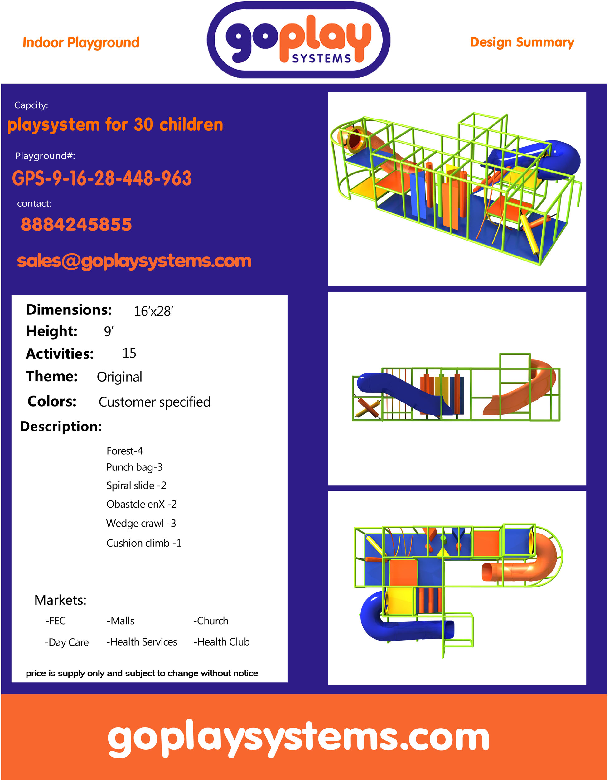 Indoor Playground GPS963 is a custom designed module soft play system developed to safely accommodate children 3 – 12 years of age. The playground system measures 9 ft. H x 16 ft. W x 28 ft.