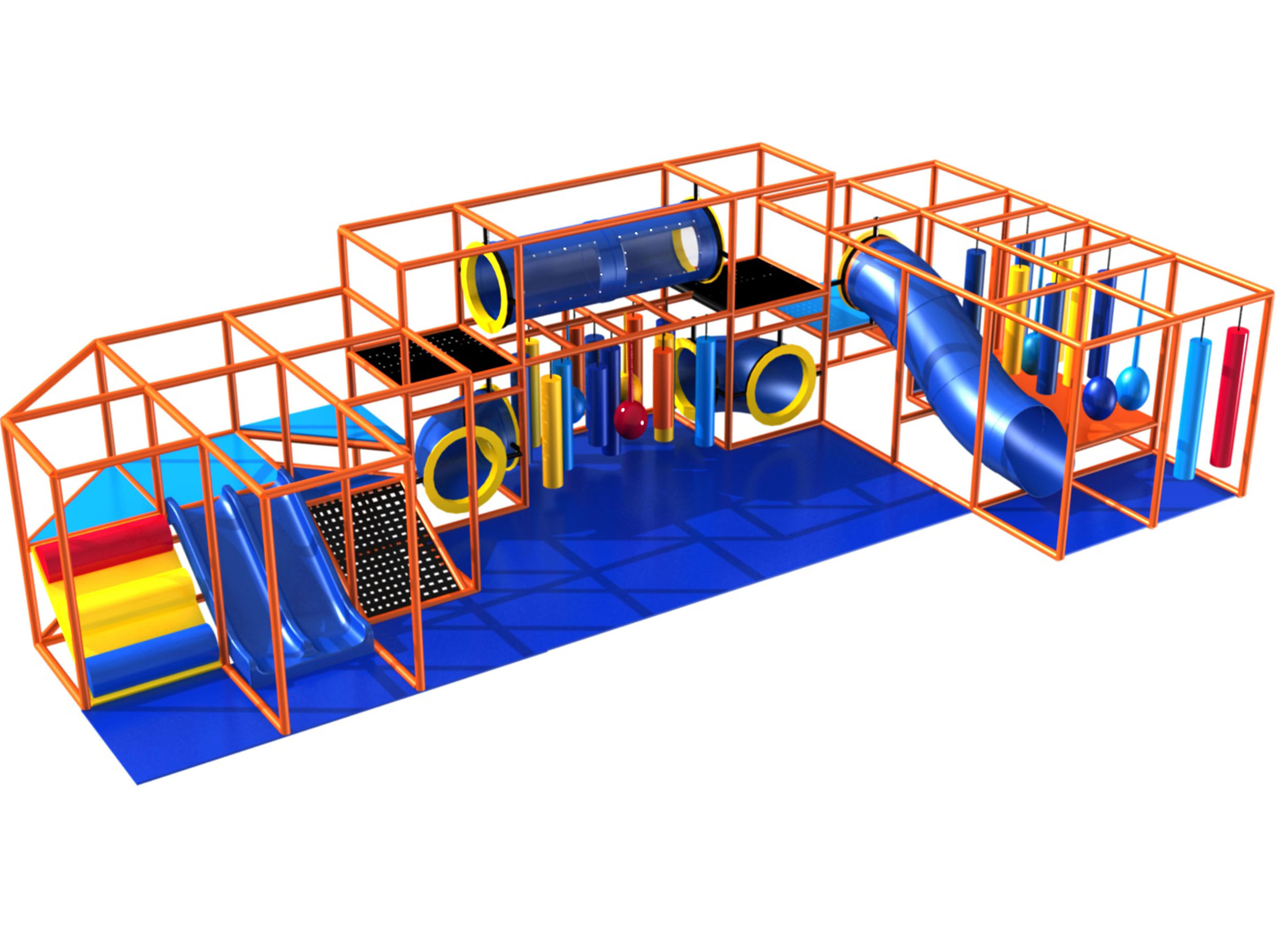 Indoor Playground GPS987 is a custom designed modular soft play system developed to safely accommodate children. The playground system measures 36 ft. wide by 9 ft. high and a length of 16 ft. The minimum indoor room space required for this playground is approximately 42 ft. room width with a 11 ft. ceiling and 22 ft. room length. Large Size Indoor Playground. This playground is suitable to fit in a low ceiling, single story room.